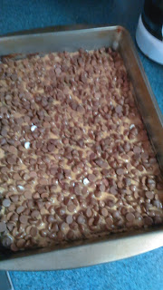 We begin by buttering the pan, or cooking spray if you prefer. Add 1 cup each of butter and brown sugar to a pot, and bring to a boil. Boil for 3 minutes, stirring occasionally. Next you layer the bottom of the pan with Graham Crackers, and pour in your boiled butter/brown sugar mixture. Bake for 4 minutes at 400 F. Remove from oven and add 3/4 cup of peanut butter. You can spread it with a spatula, but as you can see...I did not. I'll leave that up to you. Place back into the oven for a minute, until the peanut butter is melted (about 1 minute). Remove from oven and layer your chocolate on top (2 cups, and I used milk chocolate chips), and place back in oven until melted. This will probably take a minute or two. When the chocolate is melted you can then spread it out with a spatula. When you are finished spreading the chocolate, sprinkle the M % M candies over the top, and add red and green sprinkles...just for fun. Cool at room temperature, then transfer to the refrigerator to chill completely. Once it is chilled completely you will be able to break the toffee bark into pieces. Then it's time to enjoy your work!